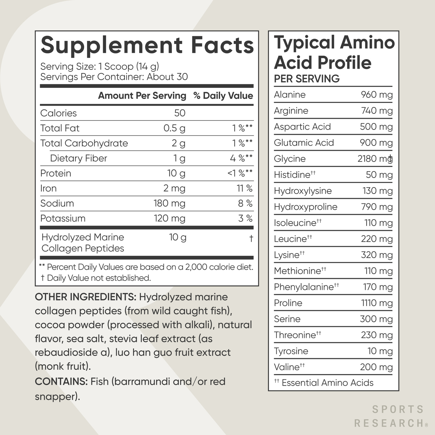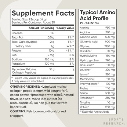 - WILD CAUGHT: Sports Research Marine Collagen Peptides is sourced exclusively from wild-caught fish. Each scoop provides 10 grams of low molecular-weight hydrolyzed collagen containing 9 grams of protein and 18 amino acids